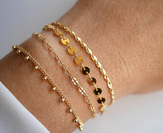 Lot de 4 Bracelets fin - Plaqué or - Gourmette fine - Doré - Chaine boules - Chaîne cercles - Minimaliste - Empilable - Tous les jours