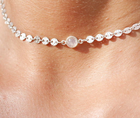Ras du cou Acanthe - Pierre de lune blanche - Chaine cercles Argent 925