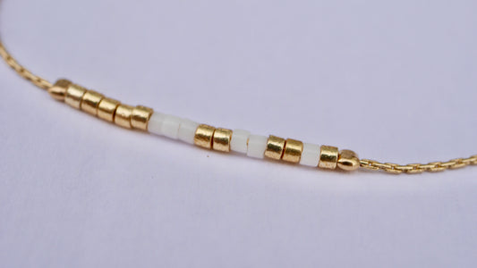 Parure collier + bracelet - Plaqué Or - Chaine serpent fine - Perles de verre Miyuki blanches et dorés - Bijoux mariage - Minimaliste - Fin
