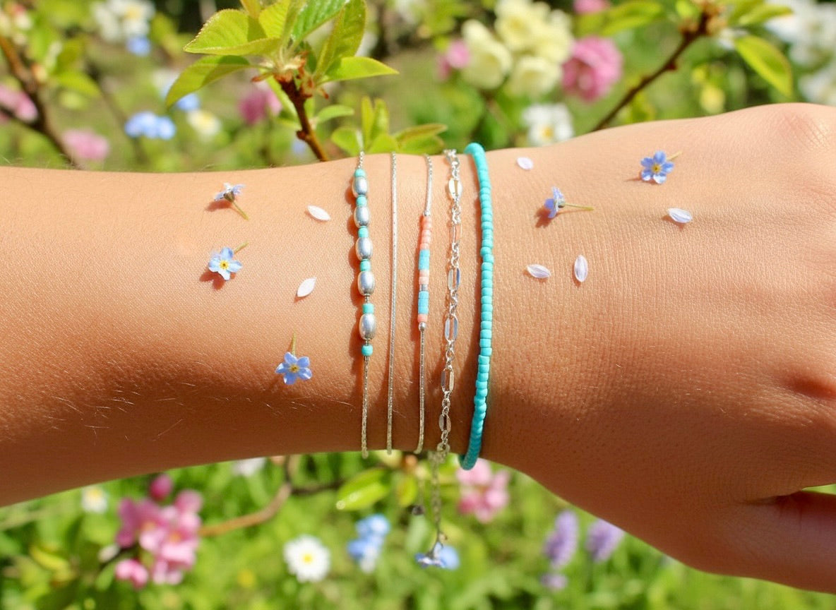 Lot de 4 Bracelets minimaliste, fin - Chaine serpent - Perles miyuki turquoise, corail, rose - Argent 925