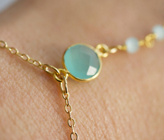 Bijoux de main Aqua - Pierre ronde vert d'eau - Chaîne rosaire menthe - Plaqué Or
