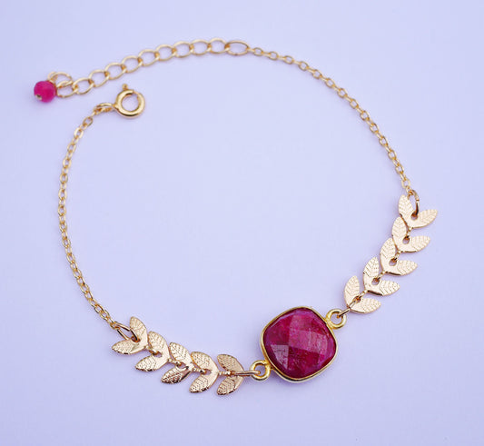 Bracelet Bégonia - Pierre Rubis carré - Rose Fushia - Chaîne épis - Plaqué Or