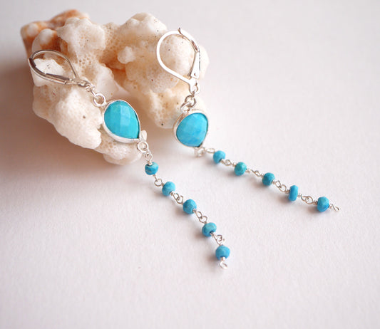 Boucles d'oreille Ondine - Pierre goutte Turquoise - Perles rosaire bleu - Argent 925