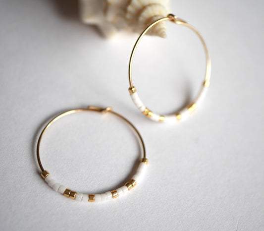 Boucles d'oreille Alysse - Créoles - Perles miyuki Blanc et doré - Plaqué Or