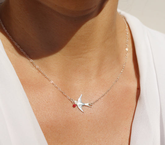 Collier Swallow - Oiseau hirondelle - Perle rouge - Argent 925