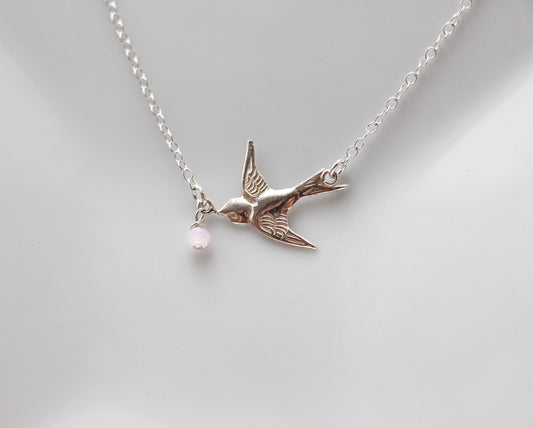 Collier Swallow - Oiseau Hirondelle - Perle de verre rose - Argent 925