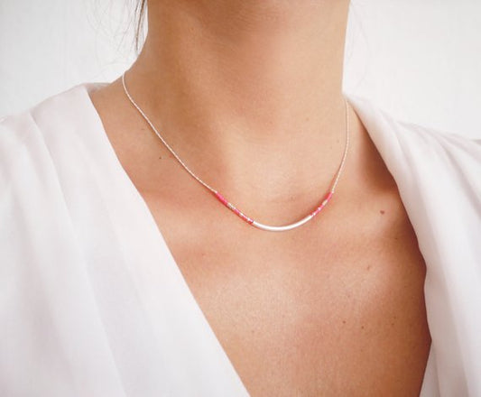 Collier Azalée - Perles Miyuki rose fluo - Chaîne serpent - Tube Argent 925