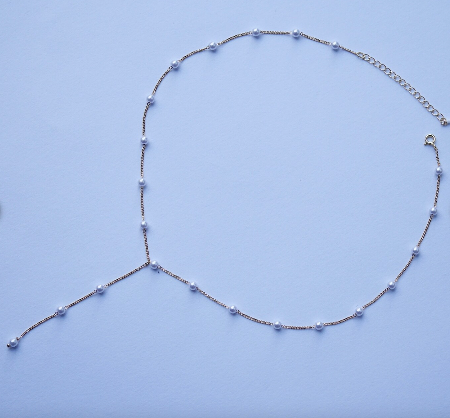 - D'un collier long lasso, en forme de Y, constitué d'une chaîne à fins maillons plaqué or, ornée de perles d'eau douce blanches de 6 mm.